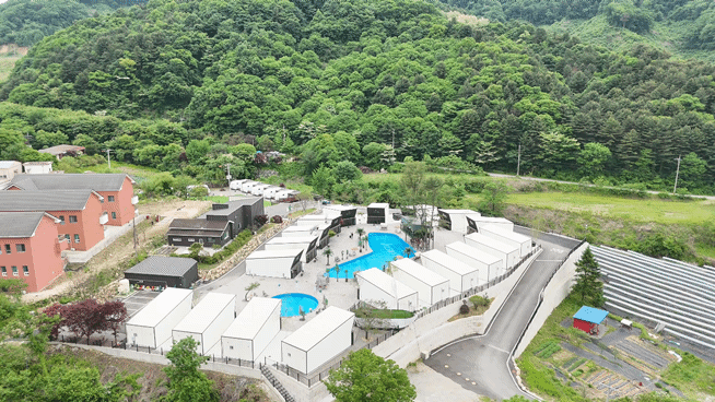 글램핑장 바로 앞에는 대형 수영장이 위치하고 있어요