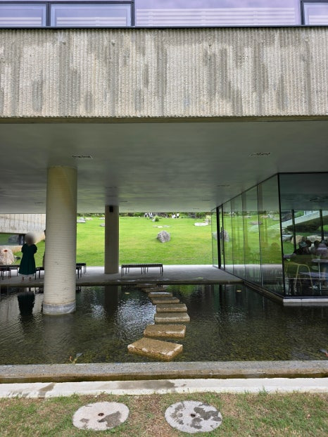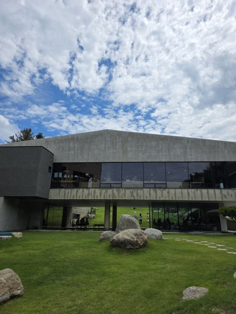 웅장한 건물과 초록빛 정원이 딱 눈에 들어왔어요. 자연을 그대로 살린 건축 디자인 덕분에 그냥 외관만 봐도 사진 각이에요 📸.