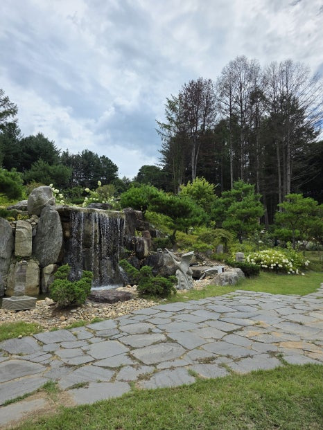 내부 구경하다가 바로 정원으로 나갔는데, 진짜 감탄이 절로! 아기자기한 꽃, 인공 폭포, 포토존까지 하나하나 신경 쓴 게 보였어요.