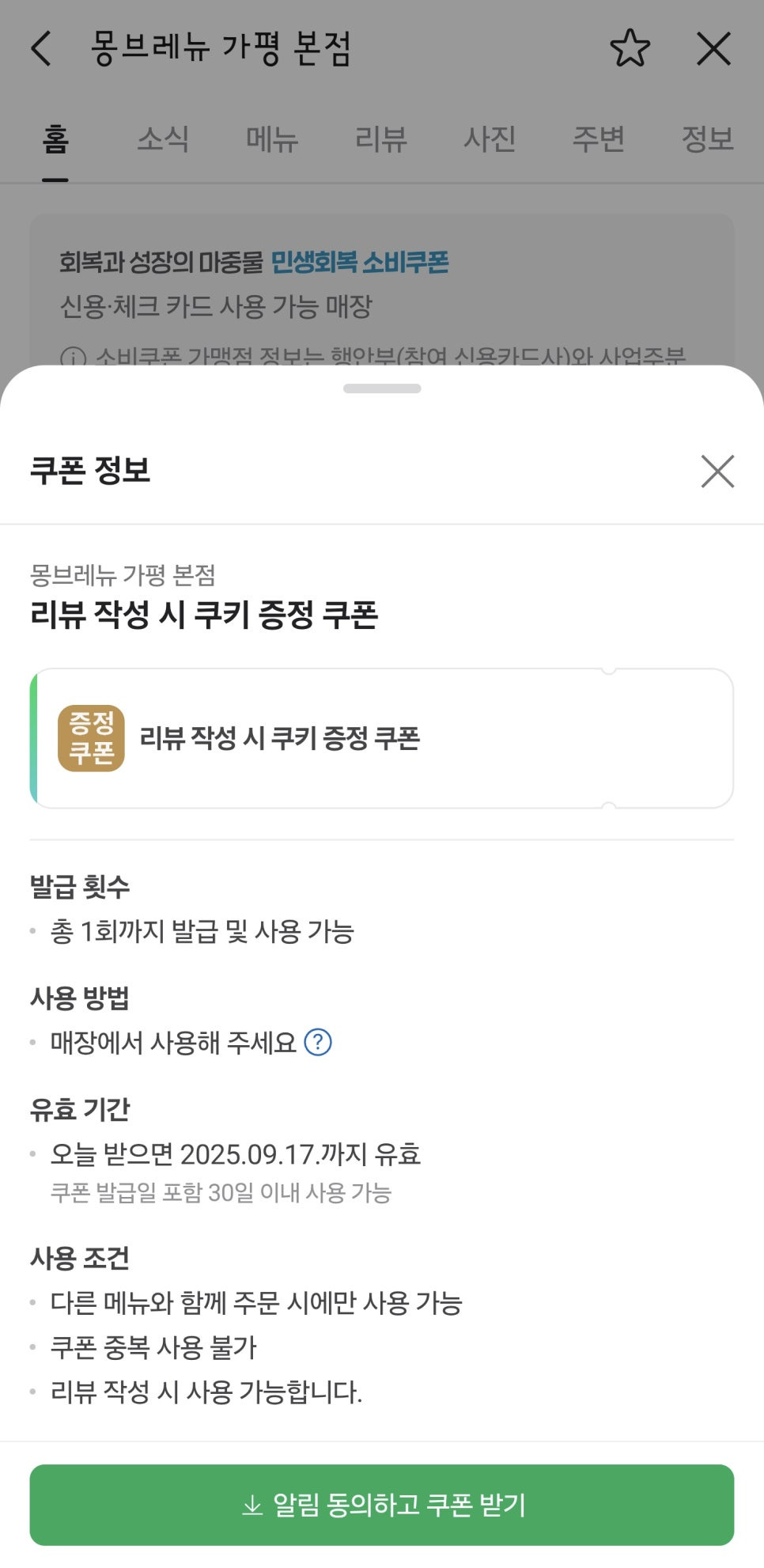 몽브레뉴 같은 경우 리뷰 작성 시 쿠키를 한개 받을 수 있어요!