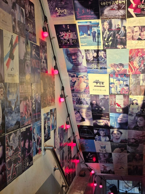 계단부터 뭔가 느낌 있어요. 벽에 붙은 영화 포스터랑 타자기 그림들이 과거 여행 온 듯한 기분을 주더라고요.