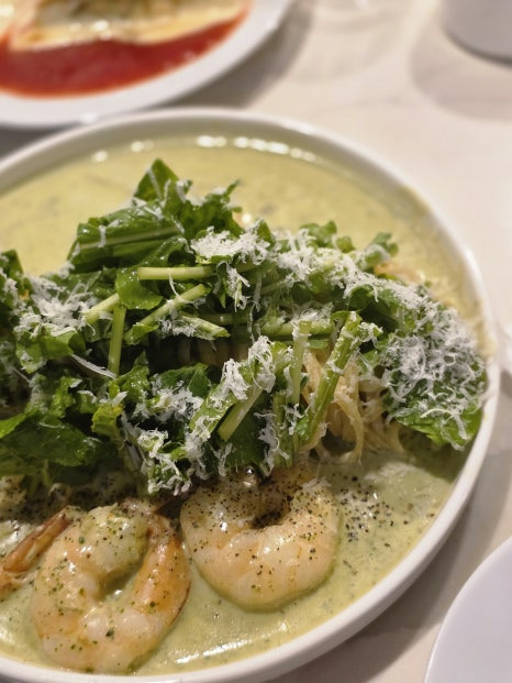시금치 파스타 → 제가 극찬했던 메뉴👏 소스가 생각보다 찰떡이었고, 빵에 소스 찍어먹는 재미까지!