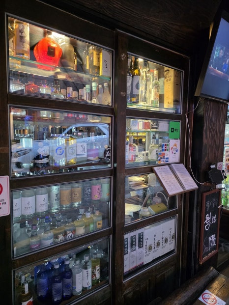 벽면에 꽉 찬 전통주 병들이 장식처럼 늘어서 있고, 한국적인 타이포그래피가 곳곳에 보여서 감성 뿜뿜했답니다.