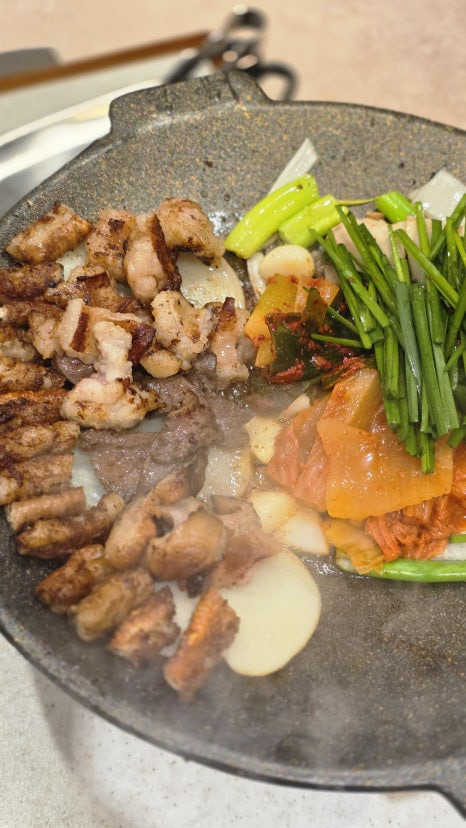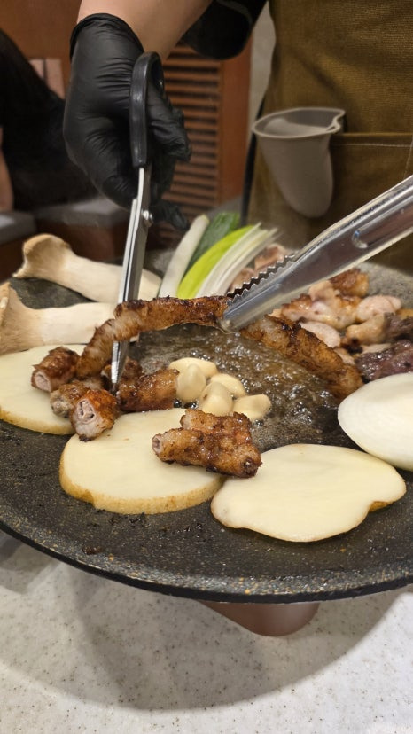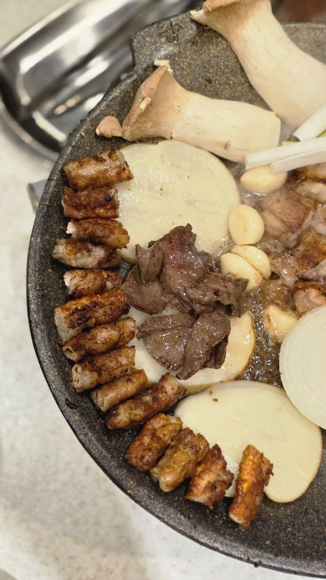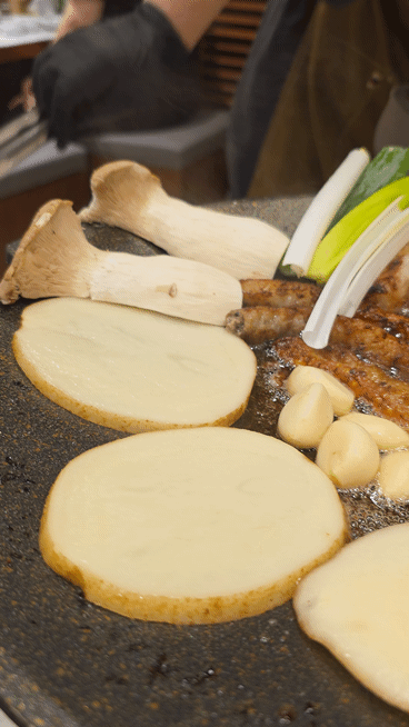 감자·버섯·양파 같이 구워주니까 느끼함이랑 밸런스 딱 살았고.