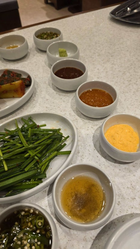 우리는 한우모듬 2인분 + 소주 한병 시켰고, 기본 반찬 구성도 꽤 정성스럽게 나오더라고