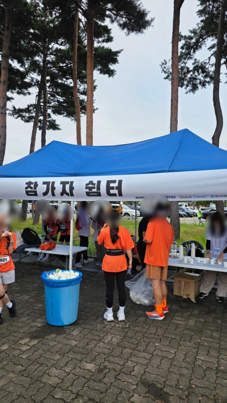 참가자 쉼터에서 물을 마실 수 있게 자원봉사자분들이 도와주시거나