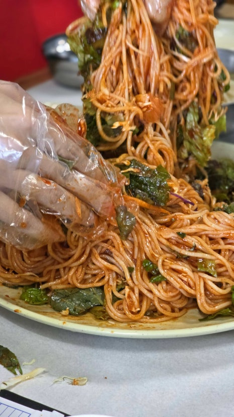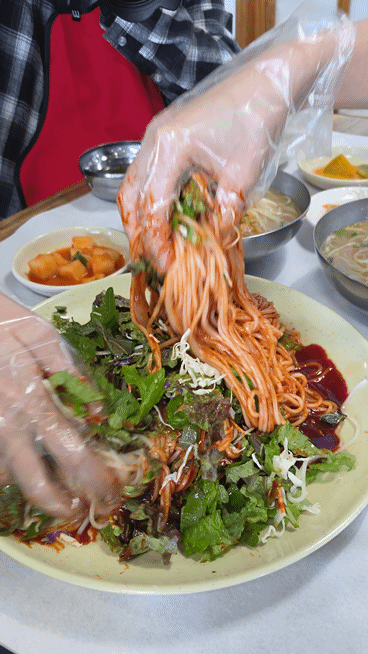 회 국수 비닐장갑 끼고 회, 채소, 면을 골고루 비벼주는 게 필수!