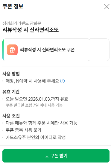 심경희라라랜드를 방문할 예정이라면, 리뷰 작성하고, 신라면리조또 드셔보는걸 추천!