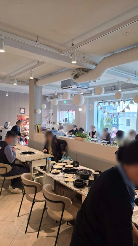 화이트 톤으로 엄청 환하고 깔끔해서 여기가 고기집인지 카페인지 헷갈릴 정도거든요. 😍 연말 데코까지 포근하게 되어 있어서 기분이 업!