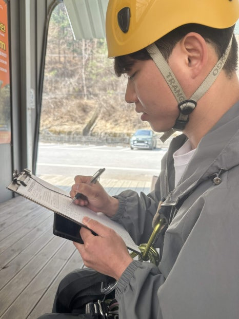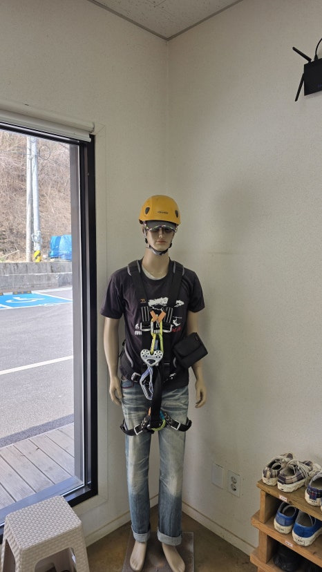 짚라인 안전 이용 수칙 교육을 듣고, 장비를 까지 착용 완료!